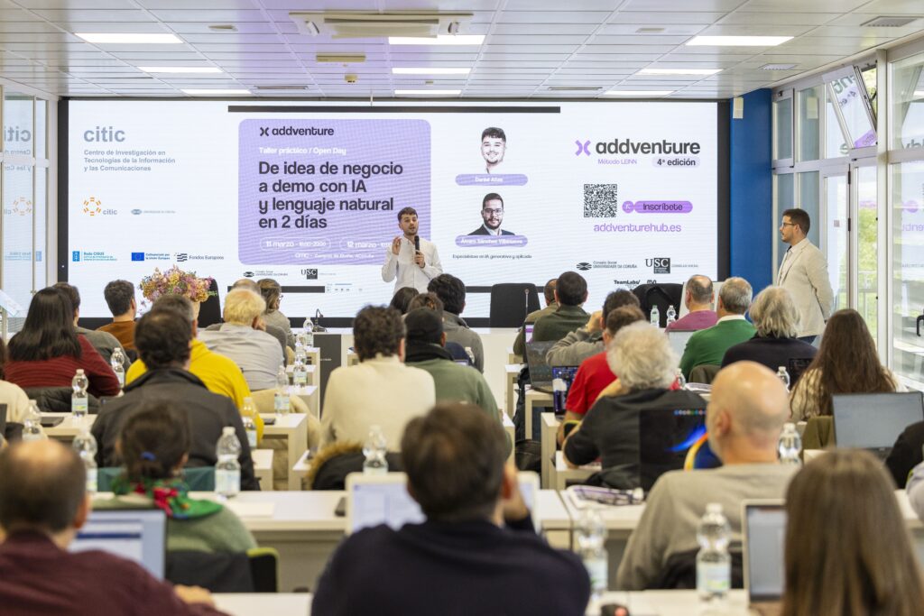 A Coruña, 12 de marzo de 2026. El programa de emprendimiento e innovación AddVenture ha celebrado en el CITIC un taller práctico intensivo centrado en uno de los retos más habituales al iniciar un proyecto emprendedor, convertir una idea en algo visible, enseñable y útil para empezar a validarlo. Durante dos jornadas, las 40 personas participantes trabajaron en el desarrollo de una primera demo de sus propuestas con ayuda de inteligencia artificial y lenguaje natural, sin necesidad de conocimientos previos de programación.
